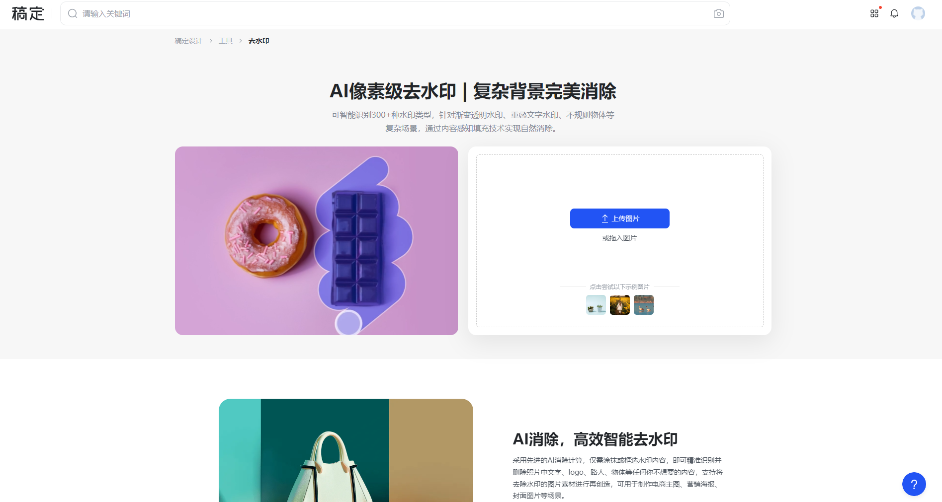采用先进的AI消除计算,仅需涂抹或框选水印内容,即可精准识别并删除照片中文字、logo、路人、物体等任何你不想要的内容,支持将去除水印的图片素材进行再创造,可用于制作电商主图、营销海报、封面图片等场景。