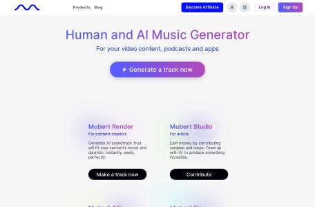 用户可以通过提供文本提示或选择情绪和风格等参数来生成音乐。Mubert为内容创作者、艺术家、开发者和听众提供不同的工具,每个工具都有特定的功能。例如,Mubert Render允许为视频生成音轨,而Mubert Studio使艺术家可以贡献样本并赚钱。