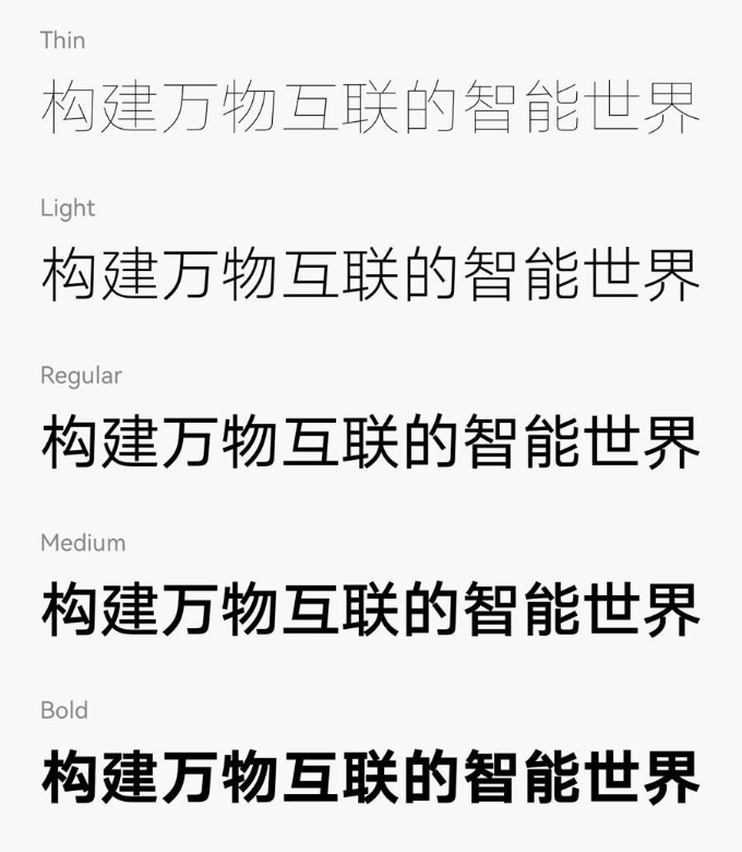 - 5种字重粗细调节。HarmonyOS Sans 支持可变特性,让用户选择他们喜欢的字体粗细来进行文本的显示。